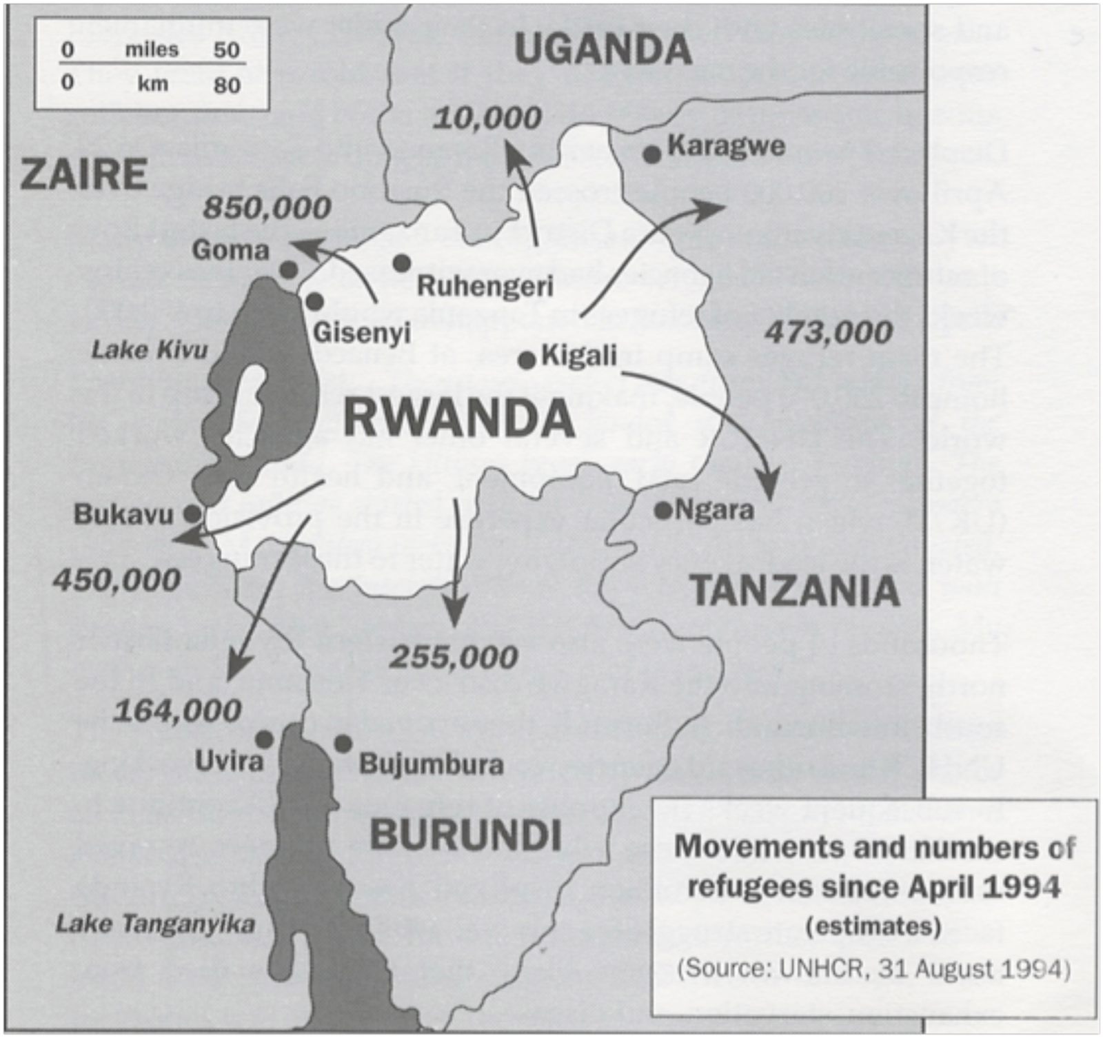 Map 2: Movements and numbers of refugees since April 1994, August 1994. (source: UNHCR)